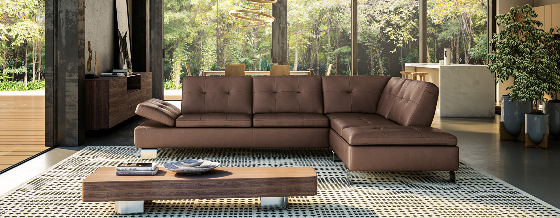 The »PRIMANTI« features adjustable arms that may be utilized as inclinable headrests or additional arm supports. Clean, architectural lines are accented by buttonless tufts and double needle tailoring.